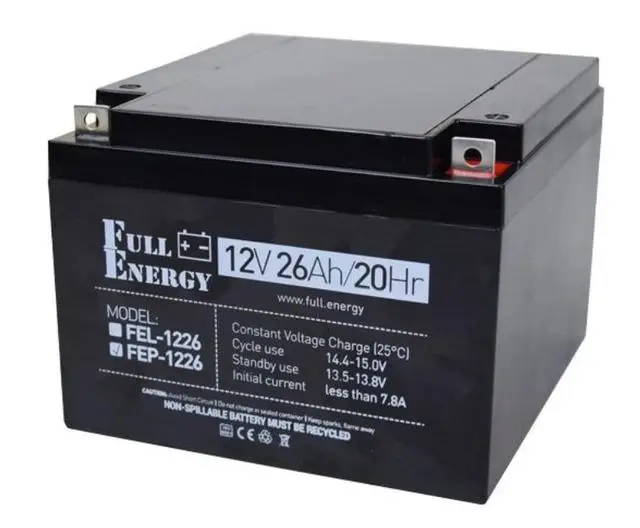 Акумулятор Full Energy FEP-1226 — це AGM свинцево-кислотна акумуляторна батарея ємністю 26 А·год та робочою напругою 12 В, яка призначена для використання у системах безперебійного живлення (ДБЖ / UPS), охоронних системах, інверторних комплексах та інших пристроях, що потребують стабільного резервного живлення. Виготовлений у герметичному корпусі з використанням технології AGM (Absorbent Glass Mat), яка передбачає утримання електроліту у скловолоконному сепараторі, що робить акумулятор безпечним у використанні, стійким до вібрацій та повністю необслуговуваним.