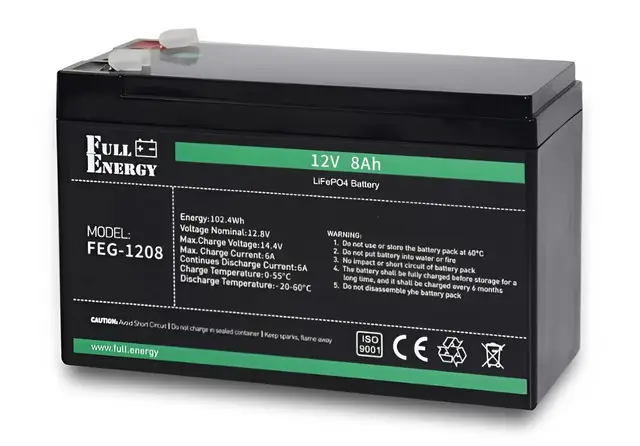 Акумуляторна батарея Full Energy FEG-128 — це літій-залізо-фосфатний (LiFePO4) акумулятор ємністю 8А·год / 102.4 Вт·год та номінальною напругою 12.8 В. Конструкція виконана у герметичному корпусі, що забезпечує стабільну, безпечну і довговічну роботу навіть при інтенсивній експлуатації.