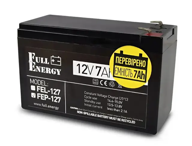 Акумулятор Full Energy FEP-127 — це свинцево-кислотна акумуляторна батарея, виконана за технологією AGM (Absorbent Glass Mat), з ємністю 7А·год та робочою напругою 12 В. Завдяки використанню абсорбованого електроліту, акумулятор герметичний, не виділяє шкідливих газів, не потребує обслуговування та є безпечним для використання в житлових приміщеннях.