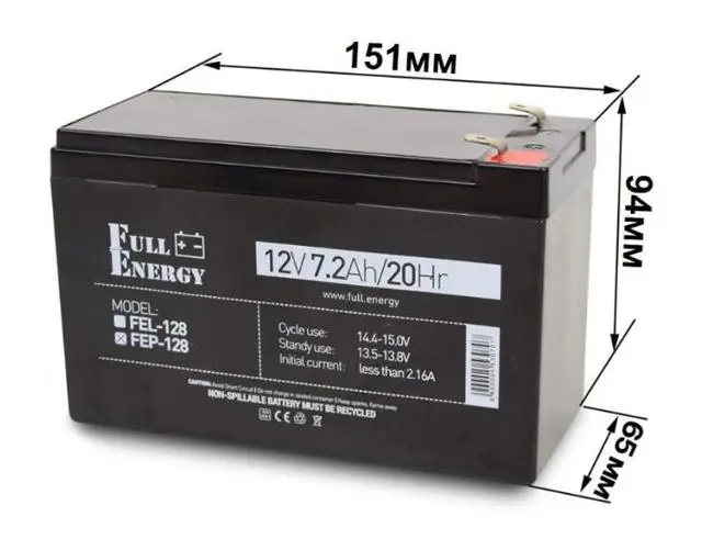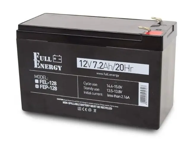 Акумулятор Full Energy FEP-128 — це свинцево-кислотна акумуляторна батарея, виконана за технологією AGM (Absorbent Glass Mat) з ємністю 7.2А·год і робочою напругою 12 В. Завдяки використанню абсорбованого електроліту, акумулятор має герметичну конструкцію, не виділяє шкідливих газів, не потребує обслуговування та є безпечним для використання в житлових приміщеннях.