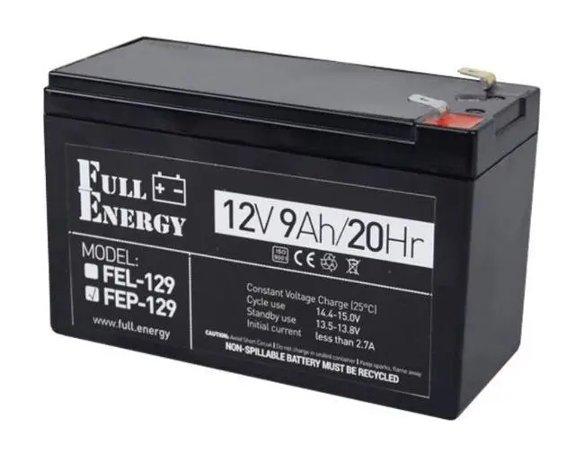 Акумулятор Full Energy FEP-129 — це свинцево-кислотна акумуляторна батарея, виконана за технологією AGM (Absorbent Glass Mat), з ємністю 9А·год та робочою напругою 12 В. Технологія AGM передбачає використання абсорбованого електроліту, що робить акумулятор герметичним, безпечним, таким, що не виділяє шкідливих газів та не потребує обслуговування протягом усього терміну служби.