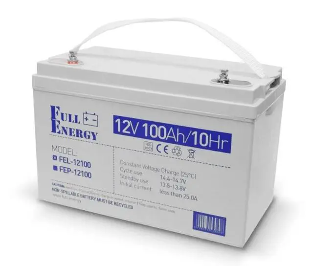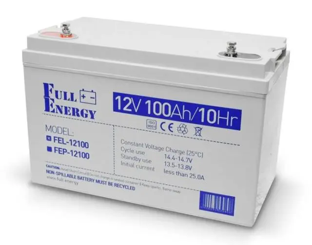 Акумулятор Full Energy FEL-12100 — це гелевий свинцево-кислотний акумулятор (GEL) ємністю 100А·год та номінальною напругою 12 В, призначений для роботи у системах безперебійного живлення (ДБЖ, UPS, інверторах), системах охоронної сигналізації, резервних енергокомплексах та іншому обладнанні, яке потребує стабільного автономного живлення. Модель виготовлена у герметичному та міцному корпусі, що забезпечує безпечну експлуатацію та тривалий строк служби.