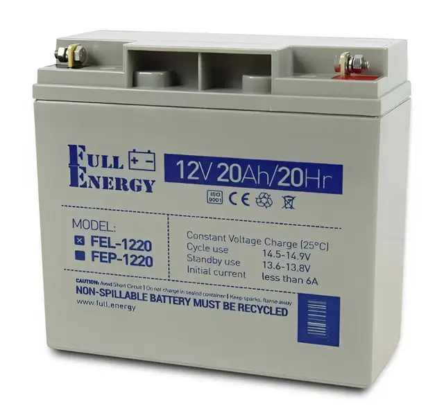 Full Energy FEL-1220 — це гелевий свинцево-кислотний акумулятор ємністю 20А·год та робочою напругою 12В, виготовлений за технологією GEL. У даному типі акумуляторів електроліт знаходиться в гелеподібному стані завдяки додаванню діоксиду кремнію, що забезпечує більш високу стабільність роботи, менший саморозряд і підвищену стійкість до глибоких розрядів.