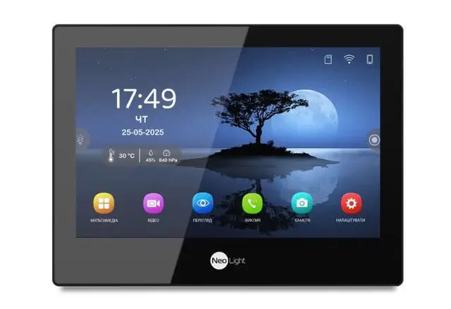 Відеодомофон Neolight ALPHA Hybrid оснащений великим IPS-сенсорним екраном 8 дюймів із роздільною здатністю 1280×800 пікселів, має Wi-Fi, LAN-порт, режим відеореєстратора з аудіо та переадресацію виклику у застосунок NeoLight на смартфон.