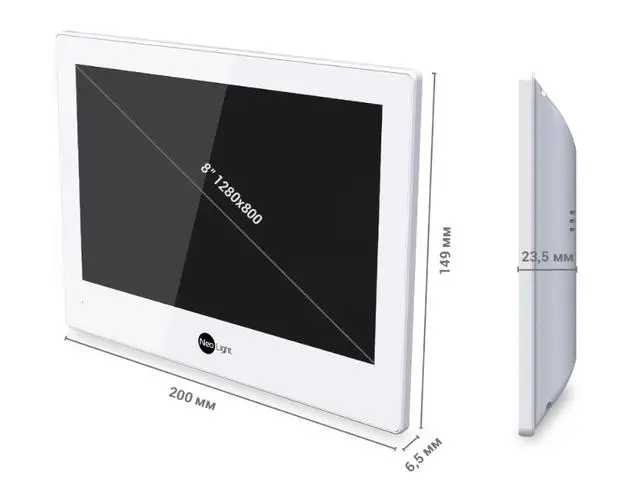 Домофон обладнано сенсорним IPS-екраном діагоналлю 8 дюймів із роздільною здатністю 1280×800 пікселів, що забезпечує чітке, яскраве й контрастне зображення. Керування здійснюється сенсорними кнопками та через сенсорний екран.