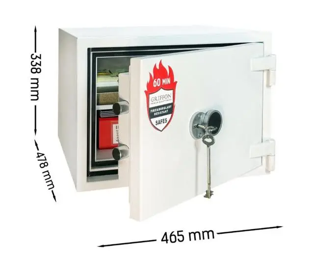 - Сейф GRIFFON FRS.32.K WHITE — вогнестійкий сейф для зберігання документів, готівки, цифрових носіїв та інших цінностей у разі пожежі або спроби злому.