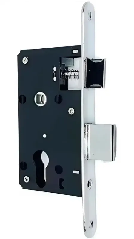 Механізм оснащений отвором під циліндр стандарту EURO DIN (серцевина купується окремо). Замок є універсальним і підходить як для лівих, так і для правих дверей. Язичок реверсивний і виготовлений зі сталі.