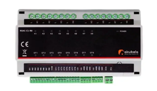 Akubela RSAC-C1-R8 — это высокопроизводительный 8-канальный переключатель-актуатор, предназначенный для централизованного управления электроприборами, освещением, приводами и другими элементами автоматизации умного дома. Устройство работает через интерфейс RS-485, который обеспечивает стабильную передачу сигнала на больших расстояниях и промышленный уровень надёжности.