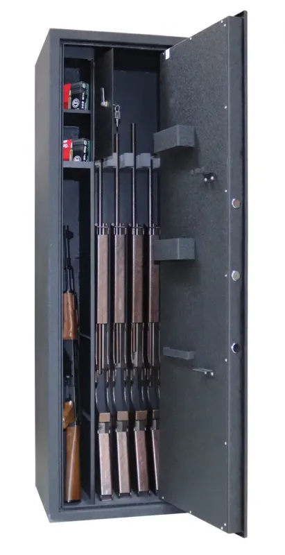 GRIFFON GS.420.K BLACK.CR - надежный антивзломный сейф для хранения оруж-я, боеприпасов и документов. Запирается сувальдным замком на три вращающихся ригеля диаметром 25 мм. Вертикальный кассовый отсек увеличенной емкости с дополнительной полкой для патронов. Сейф подходит для хранения оруж-я высотой до 1350 мм.