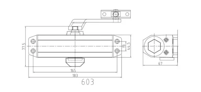 Механизм имеет регулировку скорости закрывания и дохлопа, что позволяет точно настроить силу прижатия двери к коробке в диапазоне от 15° до 0°. Корпус изготовлен из металлического сплава и имеет класс защиты IP65, что позволяет использовать доводчик как внутри помещений, так и снаружи. Ресурс работы составляет до 1 000 000 циклов открывания/закрывания, что гарантирует долговечность и надёжность при ежедневной эксплуатации.