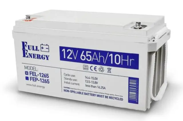 Аккумулятор Full Energy FEL-1265 — это гелевый свинцово-кислотный аккумулятор емкостью 65 А·ч и рабочим напряжением 12 В, предназначенный для использования в системах бесперебойного питания (ИБП, UPS, инверторы), пультах охранной сигнализации, телекоммуникационном оборудовании и других системах, которым необходимо стабильное и надежное резервное питание.