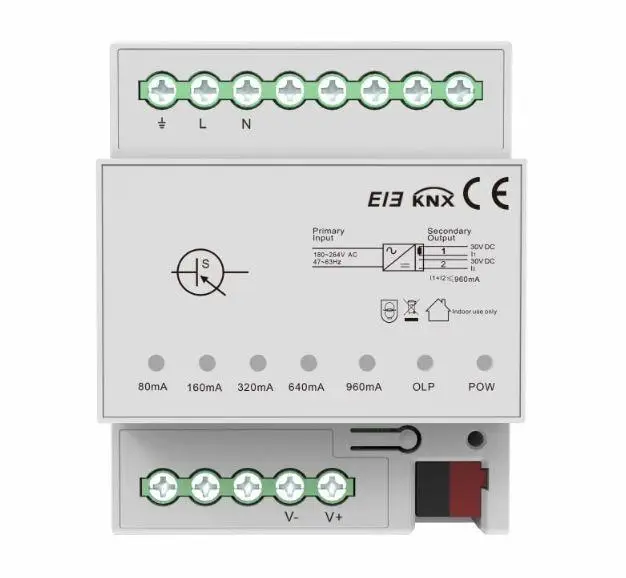 Источник питания KNX Akubela 960 мА — это контроллер питания постоянного тока 30 В, предназначенный для обеспечения стабильной работы системы EIB/KNX. Устройство оснащено двухканальным выходом с суммарным током до 960 мА, что позволяет питать как стандартные KNX-линии, так и расширенные конфигурации.