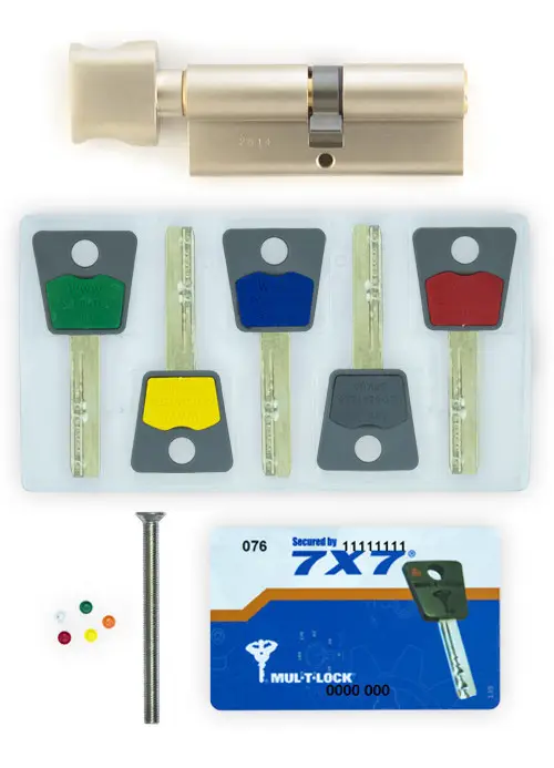MUL-T-LOCK (мультилок) сделал доступной для каждого высококачественную продукцию безопасности. MUL-T-LOCK 7х7 (мультлок) - это Security цилиндр с защищенным профилем ключа, при изготовлении которого применяется технология "одинарный пин" (имеет семь пинов, которые бывают шести размеров). Применение данной технологии сохраняет традиционное для MUL-T-LOCK высочайшее качество продукции и высокие рабочие характеристики представленного цилиндра. Корпус, пины и плуг MUL-T-LOCK 7х7 (мультилок) изготовлены из латуни.