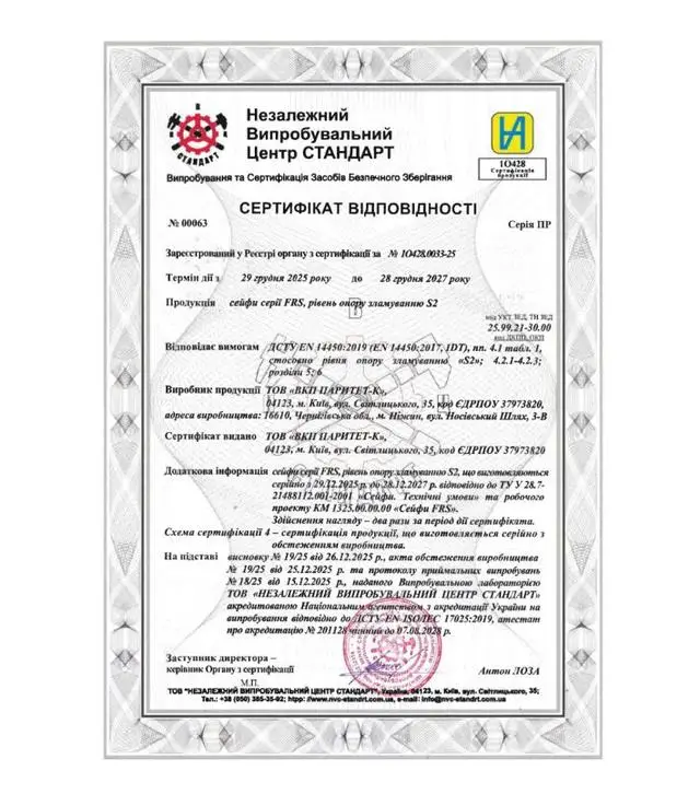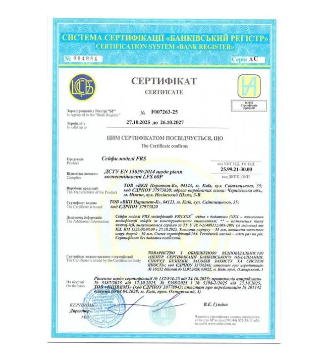 Сейфы серии FRS сертифицированы по классу огнестойкости LFS 60P согласно ДСТУ EN 15659, что гарантирует сохранность содержимого в течение 60 минут под воздействием высоких температур. Защитный слой толщиной 53 мм в сочетании с двустенной конструкцией и двойным порогом формирует эффективный барьер от тепловой нагрузки. Пространство между внешним и внутренним корпусами заполнено специальным теплоизоляционным материалом, а два контура термоленты по периметру двери при нагревании расширяются и препятствуют проникновению дыма и пламени внутрь.
