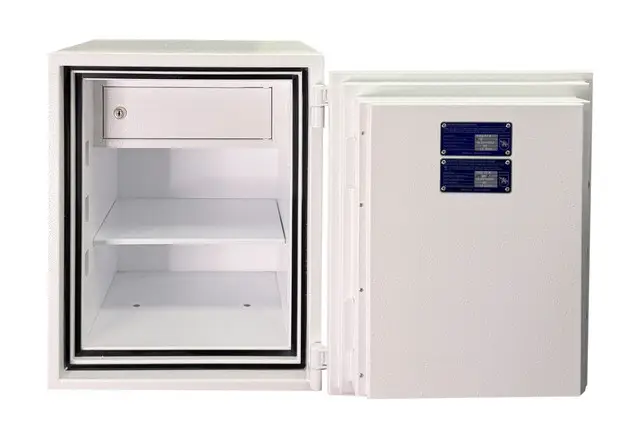 Сейф GRIFFON FRS.57.K WHITE сертифицирован по классу огнестойкости LFS 60P (ДСТУ EN 15659), что подтверждает способность сохранять содержимое невредимым в течение 60 минут действия высоких температур. Защита от тепла реализована благодаря многослойной конструкции: огнестойкому слою 53 мм, двухстенному корпусу с двойным порогом и теплоизоляционном наполнителе между стенками. По периметру дверного отвору встановлено два ряда термолентыкоторые при нагревании увеличиваются в объеме и препятствуют проникновению диму й полум’я всередину сейфа. Модель оснащена ключевым замком WITTKOPP (Германия), сертификат класса VDS 1, что обеспечивает надежность в ежедневном пользовании.