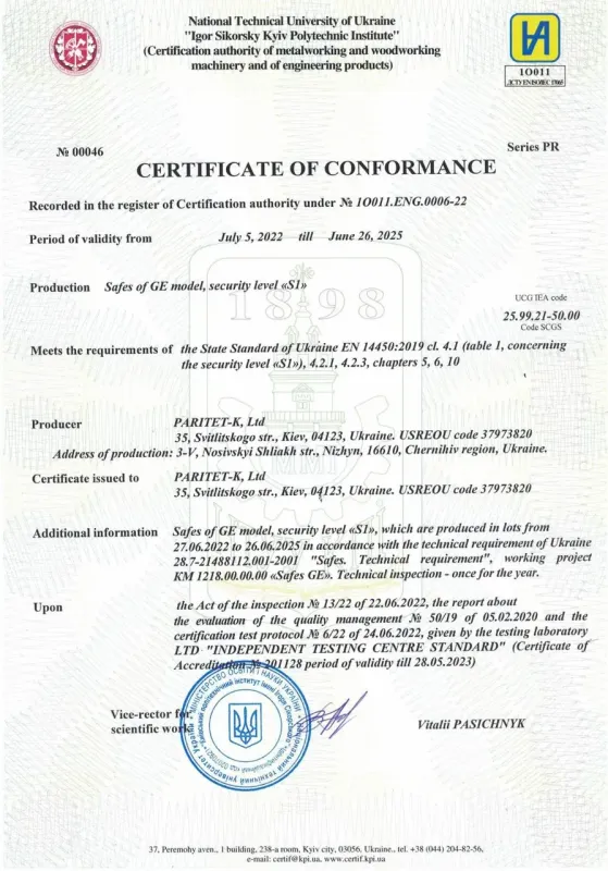 - Сейфы сертифицированы Европейским органом сертификации ECB-S по уровню сопротивления взлому S1 по EN 14450