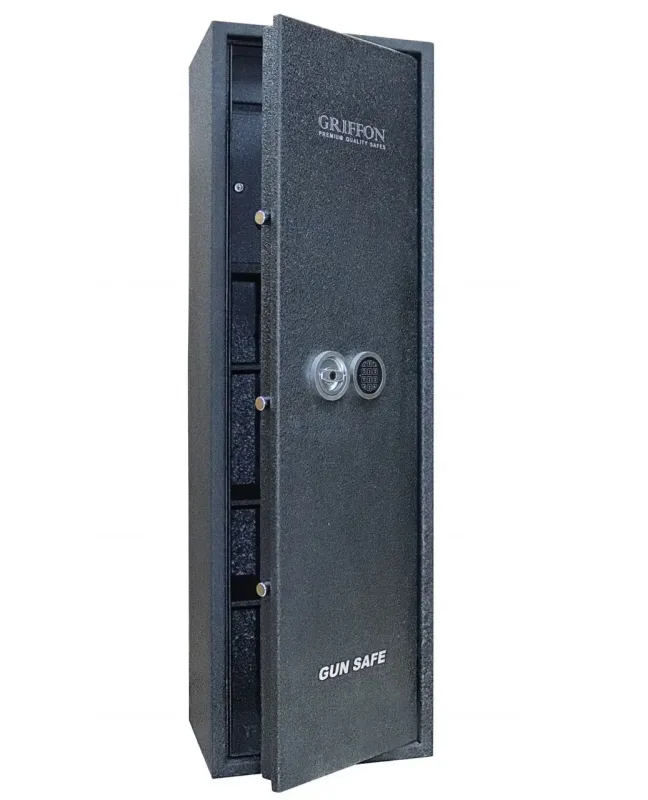 Сертифицированный взломостойкий сейф GRIFFON GE.450.E.L BLACK.CR предназначен для хранения 5 руж-й длиной до 1450 мм, пист-летов, ножей, боепр-пасов, охотничьих аксессуаров и средств по уходу за оруж-ем.