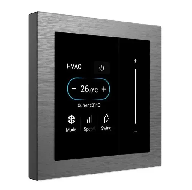 Akubela Aura — это многофункциональная панель умного управления с 2,0-дюймовым сенсорным экраном, созданная для интуитивного контроля систем «умного дома» на базе KNX. Устройство поддерживает кастомизацию текста и значков кнопок, что позволяет формировать персонализированный интерфейс под конкретные сценарии использования.