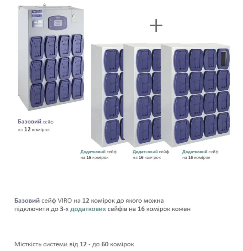 VIRO AMS - система управления доступом пользователей к боксам временного хранения небольших предметов (ключи, смартфоны, лекарственные средства, оружие и т.д.). К базовому сейфу на 12 ячеек можно подключить до 3 подсистем по 16 отделений, управляемых одной базой данных. AMS отслеживает все действия (кто взял/вернул и что именно), записывая всех пользователей и карты/ключ во внутреннюю базу данных.