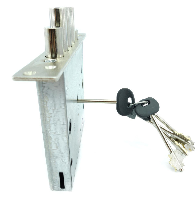Модель оснащена съёмной лицевой планкой из стали и комплектуется 5 латунными ключами и 2 декоративными накладками из нержавеющей стали.