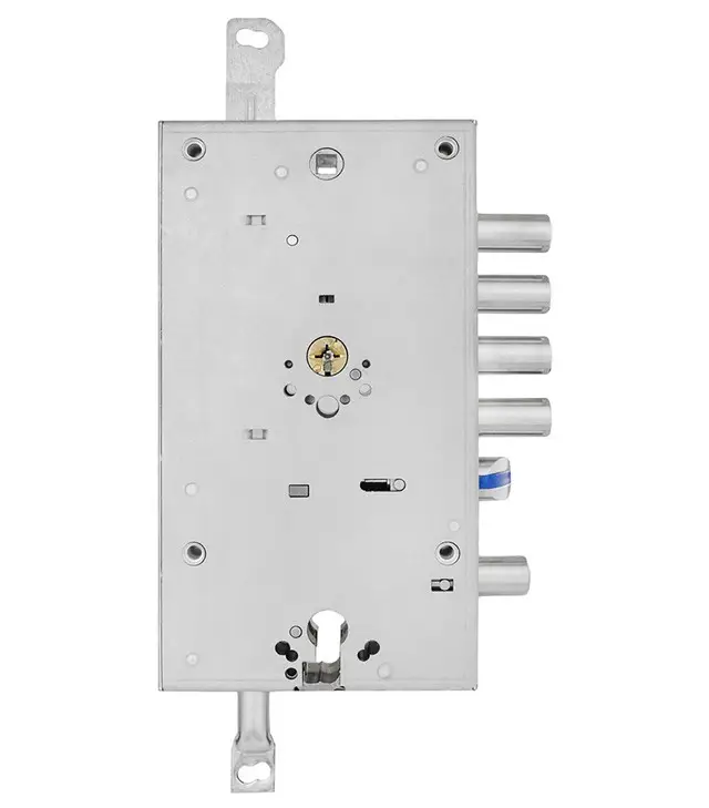 Замок имеет межосевое расстояние 85 мм и BackSet 65 мм. Оснащён 4 стальными ригелями Ø18 мм с выходом 30 мм, расстояние между ригелями — 28 мм. Есть дополнительный стальной ригель с выходом 24 мм, а также выход вертикальных тяг 20 мм. Реверсивная защёлка изготовлена из нержавеющей стали.