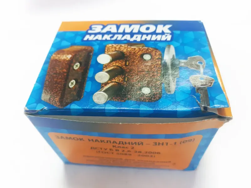 Корпус изготовлен из сплава ЦАМ, как и запорная планка. Засов прямоугольной формы — стальной. Снаружи установлен цилиндровый механизм английского типа, обеспечивающий более 30 000 комбинаций. Закрытие — в один оборот ключа. Внутри имеется фиксатор: для блокировки достаточно вставить ключ в отверстие в центре поворотной ручки. Смазка механизма и попадание влаги категорически запрещены, так как это может привести к поломке.