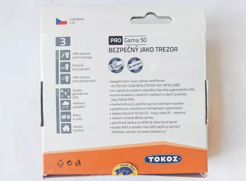 Tokoz Gama 50 OS PRO — это надежный навесной замок с высокой степенью взломостойкости, разработанный для защиты объектов, где требуется повышенный уровень безопасности. Замок сертифицирован по европейским стандартам EN 1627, EN 12320, а также соответствует требованиям НКА. Производится в Чехии.