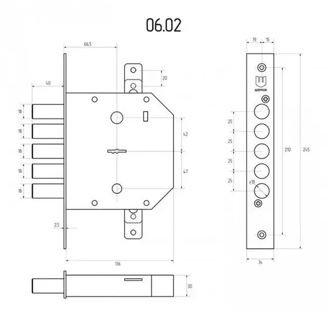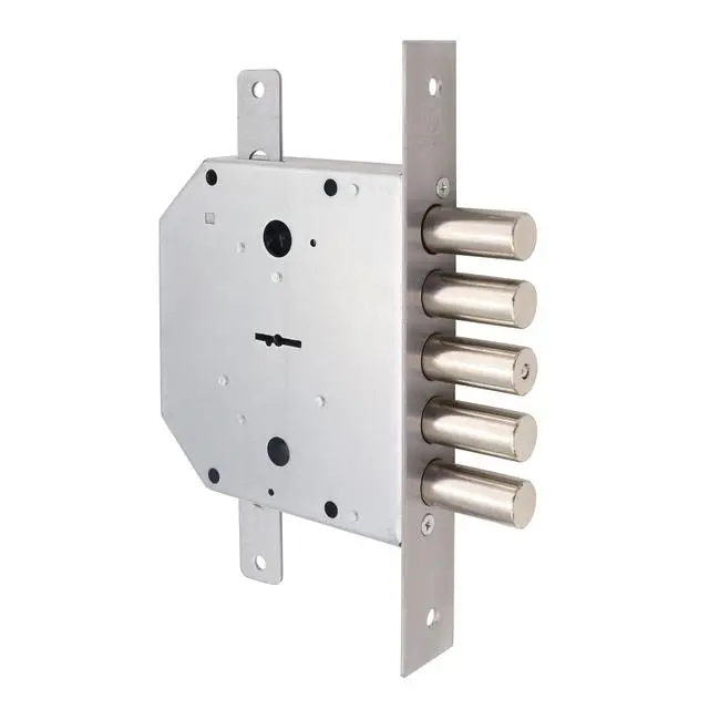 Замок врезной дополнительный сувальдный Шерлок 602T - надежный запорный механизм для установки в виде дополнительного замка в входные металлические двери и ворота. Модель оснащена сувальдным механизмом секретности и комплектуется 5 ключами. Конструкция предусматривает 5 ригелей диаметром 18 мм с вылетом 40 мм, что обеспечивает повышенную устойчивость к силовому взлому.