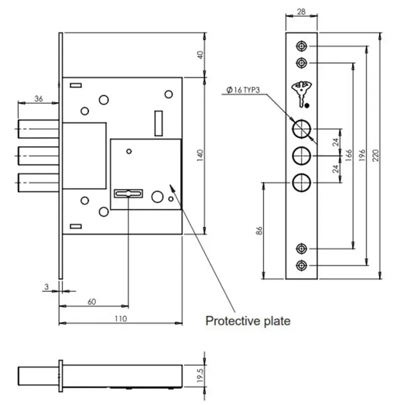 Три ригеля диаметром 16 мм обеспечивают прочность и устойчивость. Выход ригелей – 36 мм. Корпус замка защищен бронепластиной из закаленной стали, предотвращающей высверливание.