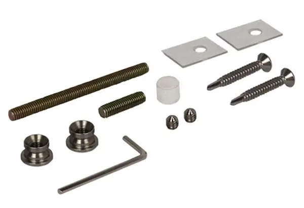 Монтаж ручок здійснюється через наскрізні отвори за допомогою шпильок, втулок і гужонів, які входять до комплекту. Конструкція дозволяє встановлювати кожну частину окремо, що особливо зручно, якщо немає можливості виконати наскрізне свердління полотна. Кріплення для скляних дверей також передбачене в комплекті.