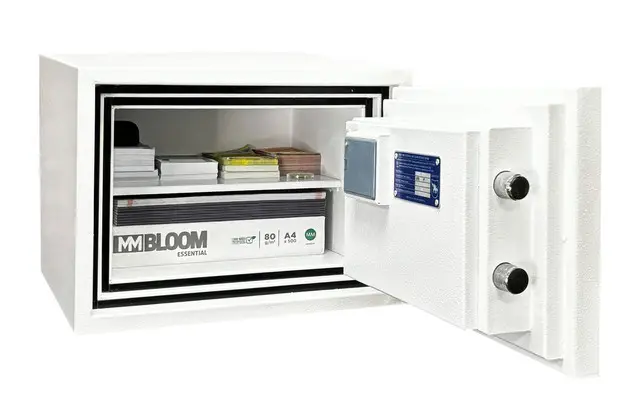 Замикання реалізоване через ригельну систему з двома активними хромованими ригелями діаметром 25 мм та антизрізами з боку петель. Навіть у разі пошкодження замка або петель ригелі залишаються зафіксованими в корпусі та не дозволяють відкрити двері. Сейф оснащений електронним кодовим замком.