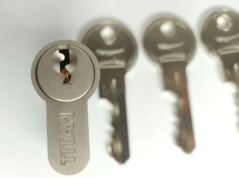 TITAN K1 – циліндри стандарту DIN з класичним англійським ключем. Деталі циліндра виконані з високоякісних матеріалів, що гарантує довгу і надійну роботу. Кодова система циліндрів TITAN K1 складається з 5 пар активних штифтів (пінів). В якості захисту від висвердлювання корпусу циліндра використовується два сталевих штифта. Два нижніх піна мають складну форму, утруднює розкриття циліндра відмичками.