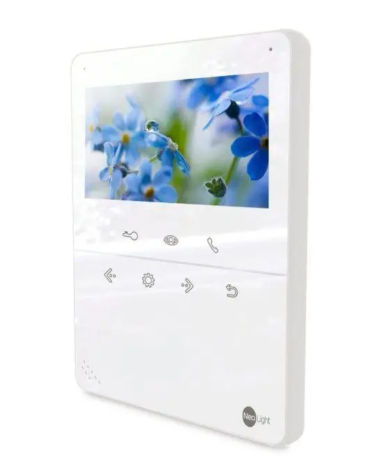 Керування пристроєм здійснюється за допомогою сенсорних кнопок із підсвічуванням, що робить користування простим і приємним навіть у темний час доби. Відеодомофон має ультратонкий корпус білого кольору та вбудований блок живлення, що спрощує монтаж.