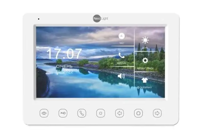 На передній панелі домофона розташовані сенсорні кнопки керування для зручної роботи з пристроєм. Користувач має доступ до таких функцій: