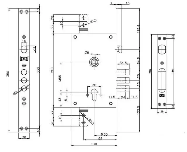 Завдяки наявності виходів для тяг модель може використовуватися в багатозапірних системах. Торцева планка нікельована. Замок сумісний за конструкцією із замками серії KALE 352.