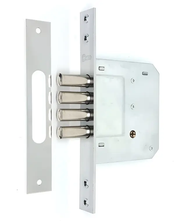 Повне зачинення замка відбувається після трьох повних обертів ключа, при цьому чотири круглі сталеві ригелі висуваються майже на 30 мм, забезпечуючи надійну фіксацію дверного полотна.