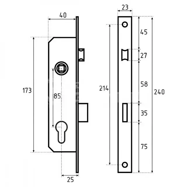 Корпус замка CLASS 153-25 відноситься до серії вузькопрофільних врізних циліндрових замків і застосовується для встановлення в алюмінієві та металеві двері з вузьким профілем, а також у профільні хвіртки. Завдяки компактним розмірам і глибині посадки (Backset 25 мм), замок можна встановлювати в вузькі дверні профілі без додаткової доробки.
