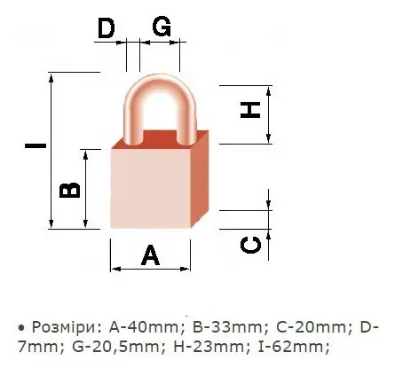 Розміри: A – 40 мм, B – 33 мм, C – 20 мм, D – 7 мм, G – 20,5 мм, H – 23 мм, I – 62 мм