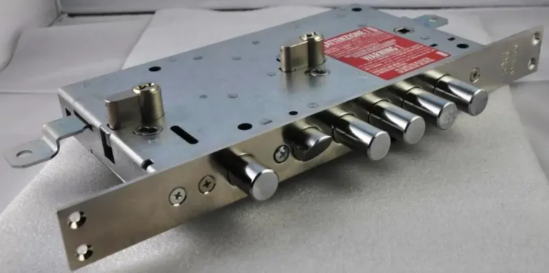 - Нижній замок керує одиночним ригелем і блокує верхній замок при повному закритті.
