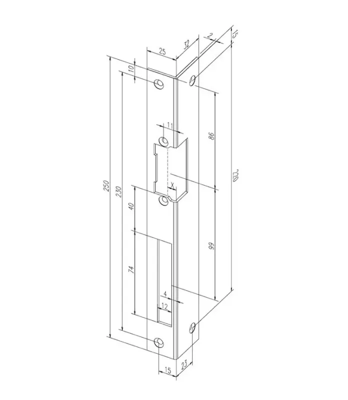 Розміри (висота х ширина х глибина х товщина) – 250 х 25 х 32 х 2 мм.